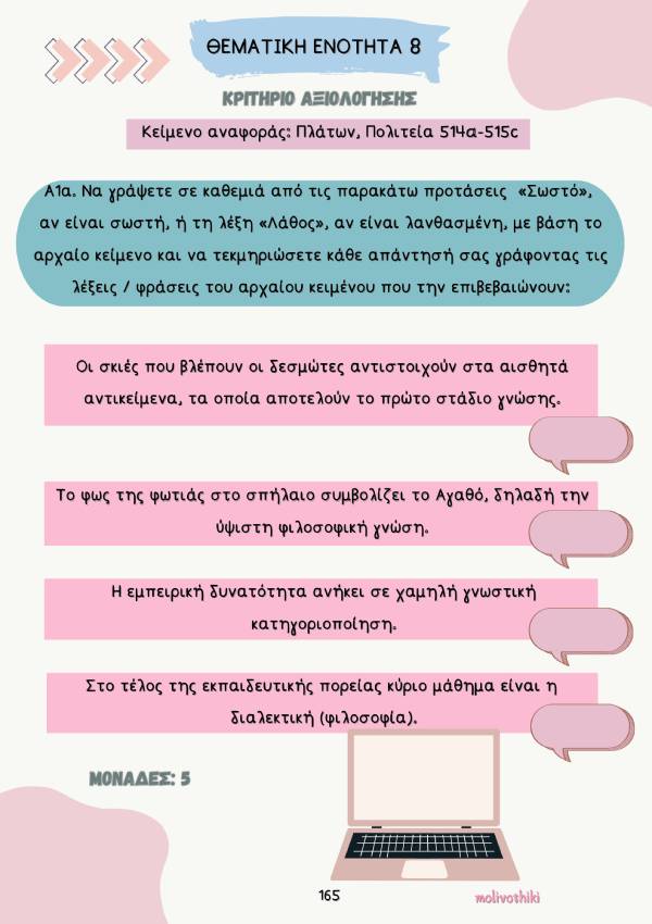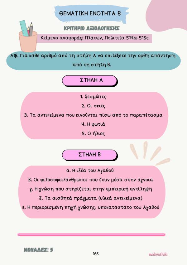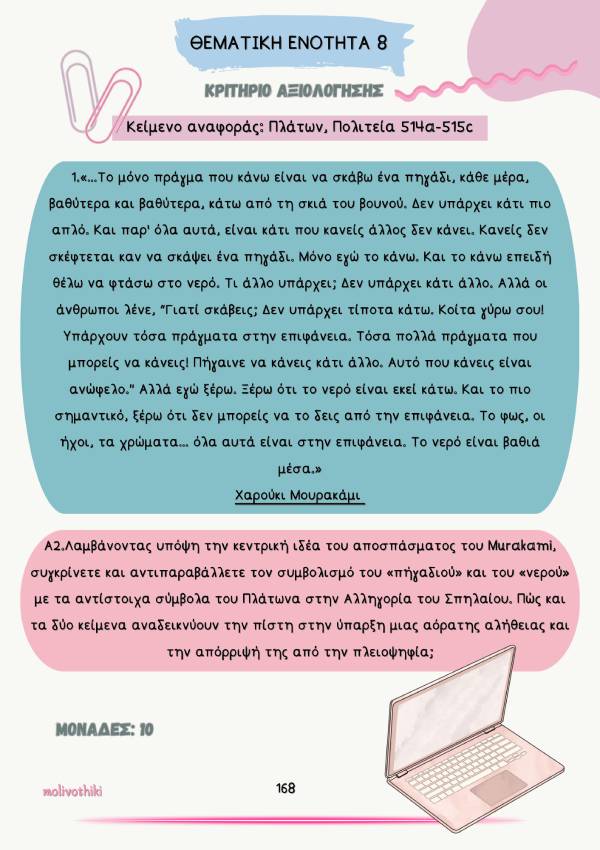 - Κριτήρια αξιολόγησης προς εξάσκηση ανά θεματική ενότητα, που περιλαμβάνουν ερωτήσεις κατανόησης, ερμηνείας και παραγωγής λόγου , αλλά και λεξιλογικές ασκήσεις .